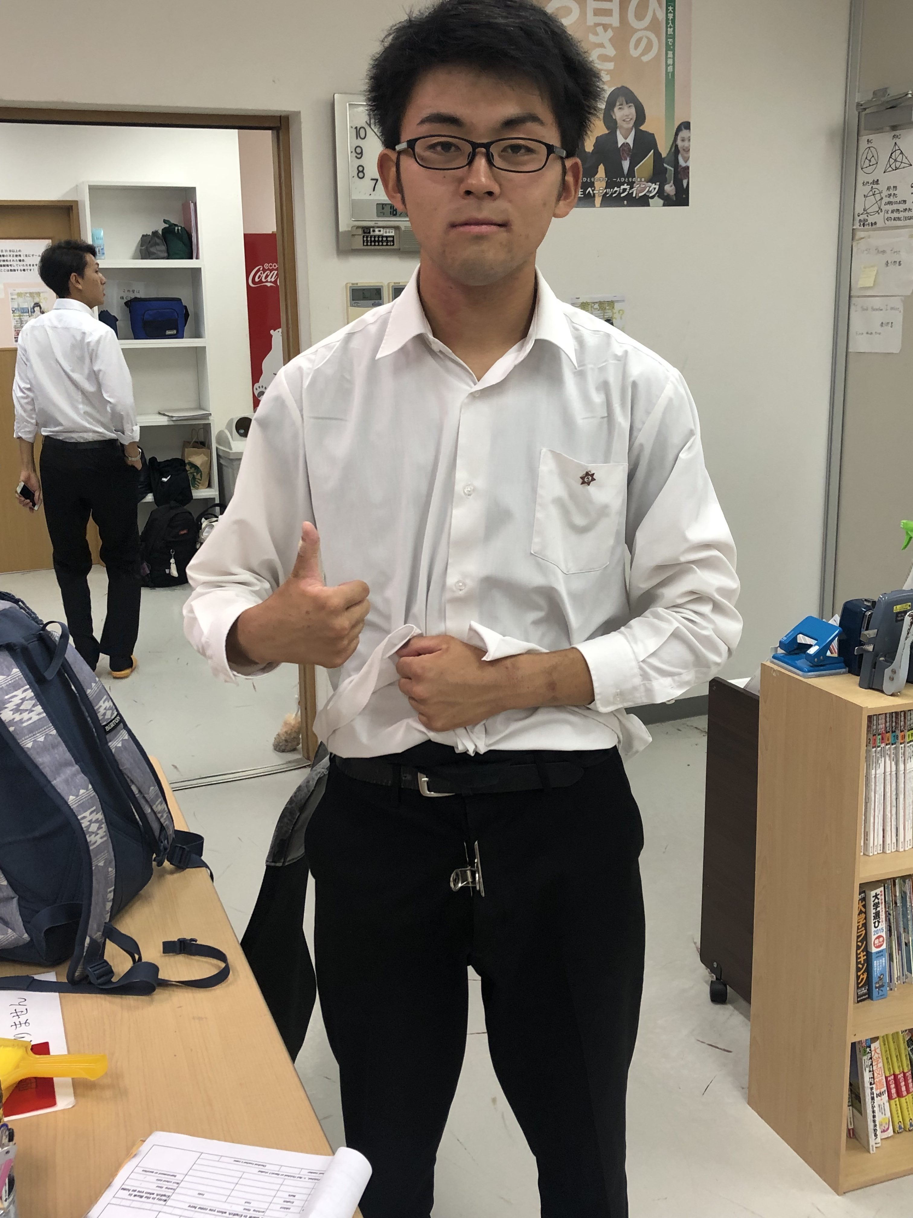 チャックが壊れて、全開で来塾してました。